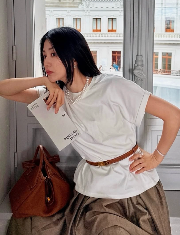 흰색 티셔츠에 브라운 벨트, 풍성한 스커트로 클래식한 무드를 연출한 첫 번째 스타일은 도시적인 창가 풍경과 어우러져 파리지앵 감성을 자아냈다.