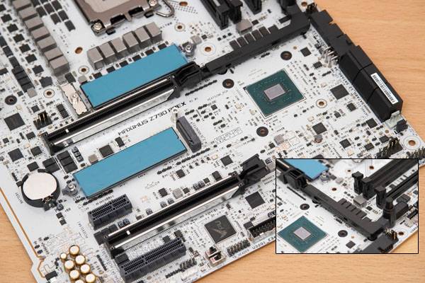 상단에 위치한 M.2 슬롯은 CPU를 통해 연결되며 M.2 2242/2260/2280 규격에 PCIe 4.0 x4 모드로 동작한다. 하단 슬롯은 Z790 칩셋에서 연결되고 PCIe 4.0 x4 또는 SATA 모드로 사용할 수 있는데, 히트싱크 하나에 여러 개의 M.2 SSD를 붙은 것보다 개별 쿨링 효과가 더 좋을 것으로 보인다. 양면 M.2 SSD를 위해 써멀 패드가 붙은 백플레이트가 적용됐으며, 나사 없이 간편하게 설치/제거 가능한 Q-래치(M.2 Q-Latch) 기능을 지원한다.
