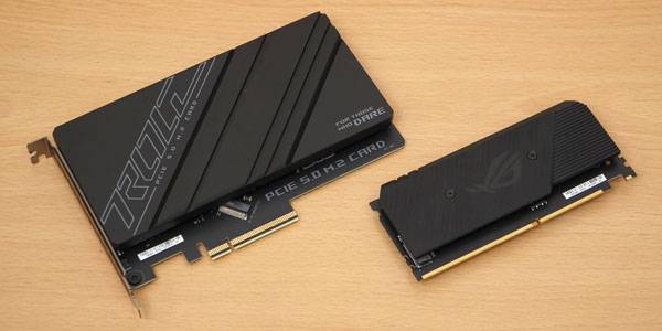 PCIe 5.0 M.2 카드와 ROG DIMM.2 카드 모두 PCIe NVMe M.2 SSD를 장착하기 위한 확장 카드로 메인보드 PCIe 5.0 슬롯 및 DIMM.2 슬롯을 사용하기 때문에 M.2 슬롯 공간을 절약할 수 있고 자체 히트싱크를 통해 발열 관리 측면에서도 유리하다.