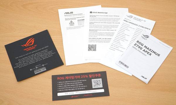 그 밖의 제품 구성품으로는 빠른 시작 설명서, 안전 가이드, ASUS 웹스토리지 안내문, ROG 환영카드, Q-커넥터, M.2 소켓용 고정 부품과 M.2 Q-래치 패키지 등이 들어갔다. 다만 이전 모델에는 포함됐던 RGB LED 연장 케이블, SATA 데이터 케이블, 그래픽 카드 고정 지지대 등은 빠진 것으로 나타났다.