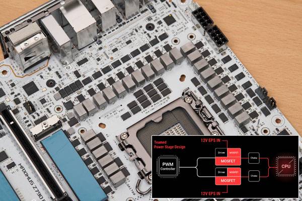 저전력 모드에서 최대 부하 모드로 빠르게 전환하여 메인보드 전원 설계에 부하를 주는 최신 CPU 아키텍처에 대응하기 위해 ROG VRM 아키텍처는 팀 구성 전력 스테이지를 활용하여 전류를 빠르게 회전시키는 동시에 전체 열 관리 개선에도 도움을 준다.