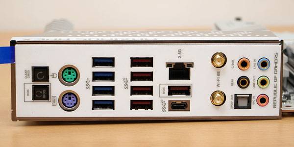후면 I/O 포트는 바이오스 플래시백 버튼과 CMOS 클리어 버튼, PS/2 키보드 포트와 마우스 포트, 4개의 USB 3.2 Gen1 포트(블루), 5개의 USB 3.2 Gen2 포트(레드), USB 3.2 Gen2x2 Type-C 포트, 2.5Gbps 이더넷 포트, Wi-Fi 6E 지원 무선 안테나, 금도금 처리가 된 오디오 잭 및 S/PDIF 광 출력 단자가 들어간다.