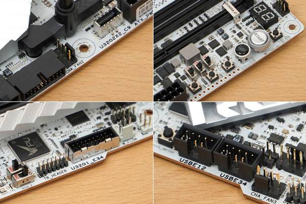 USB 3.2 Gen 2x2 및 USB 3.2 Gen1 내부 커넥터도 안정적인 케이블 연결이 가능한 금속 재질 커버를 사용하고 있으며, USB 2.0 확장 헤더와 썬더볼트 확장 헤더도 배치되어 있다.
