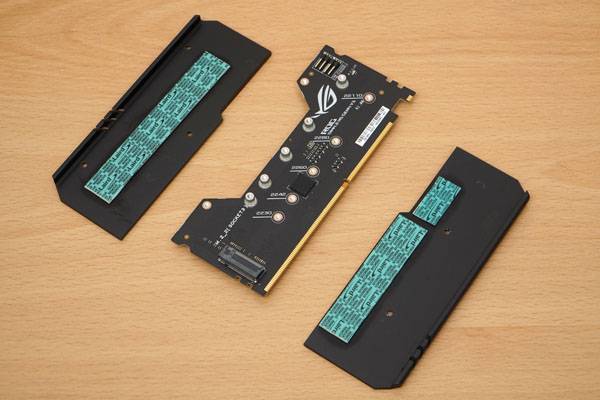 ROG DIMM.2 카드는 앞뒤로 M.2 2242/2260/2280/22110 규격의 PCIe 4.0 x4 M.2 SSD를 2개 동시에 장착해 메모리 슬롯 옆에 설치할 수 있다. 대형 히트싱크가 2개의 M.2 SSD에서 발생하는 열을 각각 처리한다.