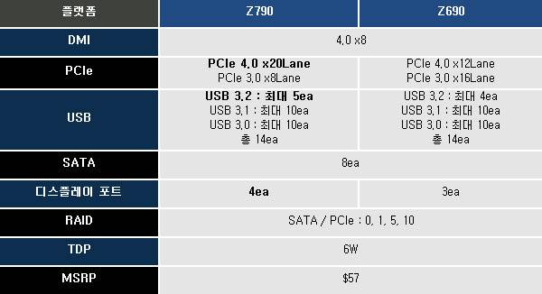 12세대 및 13세대 인텔 코어 프로세서를 지원하는 인텔 Z790 칩셋은 기존 Z690과 비교해 PCIe 4.0 레인 구성이 8개 더 늘어나고, USB 3.2 포트도 증가했으며, 내장 그래픽 동시 출력이 가능한 그래픽 포트 숫자도 4개로 늘렸다. 여기에 메인보드 차원에서 더 많아진 코어와 높아진 클럭, 증가된 소비 전력, 향상된 DDR5 오버클럭 메모리 지원 등 랩터 레이크에 최적화된 설계가 들어간다.