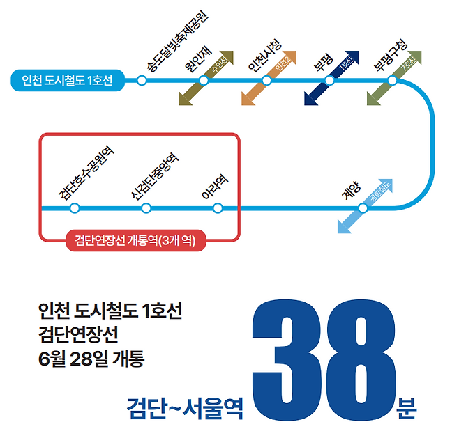 인천 도시철도 1호선 검단연장선이 6월 28일 정식 개통됐습니다. 국토교통부는 이날 새벽 5시 30분 첫차 운행이 시작됐다고 밝혔습니다. 사업비 7조 9000억 원이 들어간 이번 연장사업으로 구간 길이는 6.8㎞가 늘었고 3개 정거장(아라·신검단중앙·검단호수공원역)이 더 생겼습니다. 그간 검단호수공원역에서 서울역까지는 버스와 지하철을 이용해 70분이 걸렸으나 검단연장선을 이용하면 38분 만에 이동할 수 있습니다. 그동안 검단에서 계양역까지는 버스로 40분, 승용차로 20분이 걸렸으나 검단연장선으로는 8분이면 충분합니다.