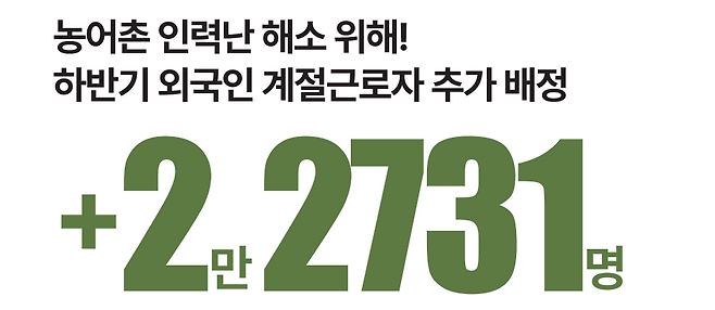 일손 부족에 시달리는 국내 농어촌을 위해 정부가 올 하반기 전국 100개 지방자치단체에 외국인 계절근로자 2만 2731명을 추가 배정합니다. 법무부와 농림축산식품부 및 해양수산부 등 관계부처는 6월 24일 ‘외국인 계절근로자 배정심사협의회’를 열었다며 이같이 밝혔습니다. 이번 배정심사협의회에선 올해 상반기 배정인원 외 추가로 인력이 필요한 농어촌 배정에 중점을 뒀다고 정부는 설명했습니다.