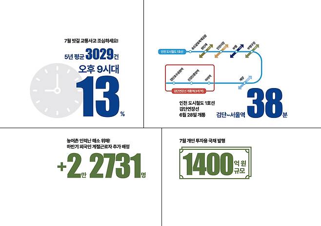 7월 정부가 빗길 안전운전을 당부했습니다. 농어촌 인력난 해소를 위해 외국인 계절근로자 추가 배정하며, 인천 도시철도 1호선이 정식 개통됐습니다. 기획재정부는 7월 개인 투자용 국채를 발행했습니다. 자세한 내용은 정책주간지 'K-공감'을 확인하세요.