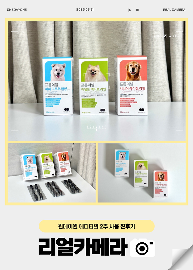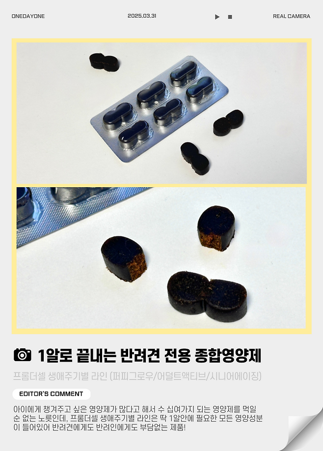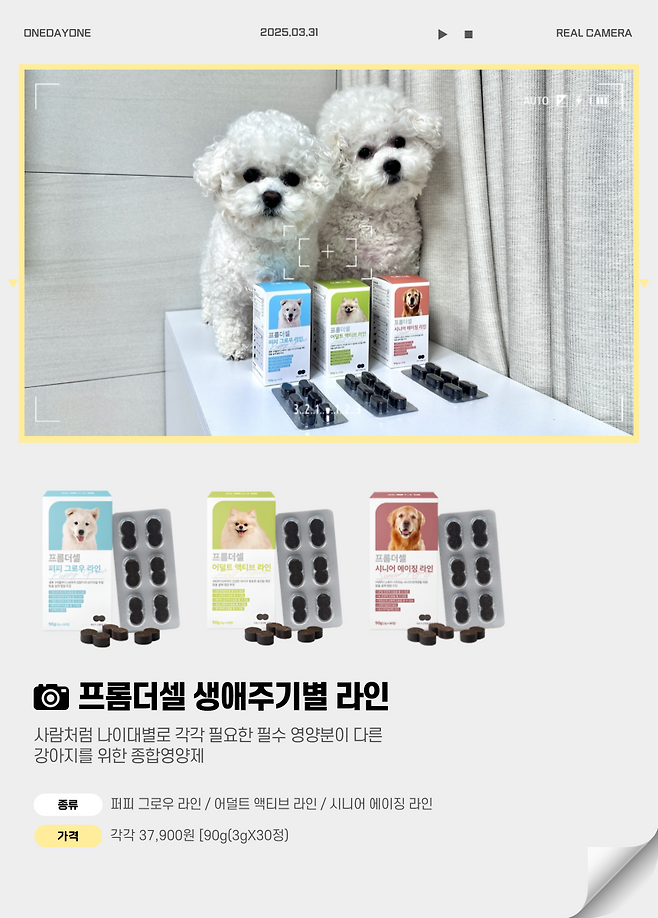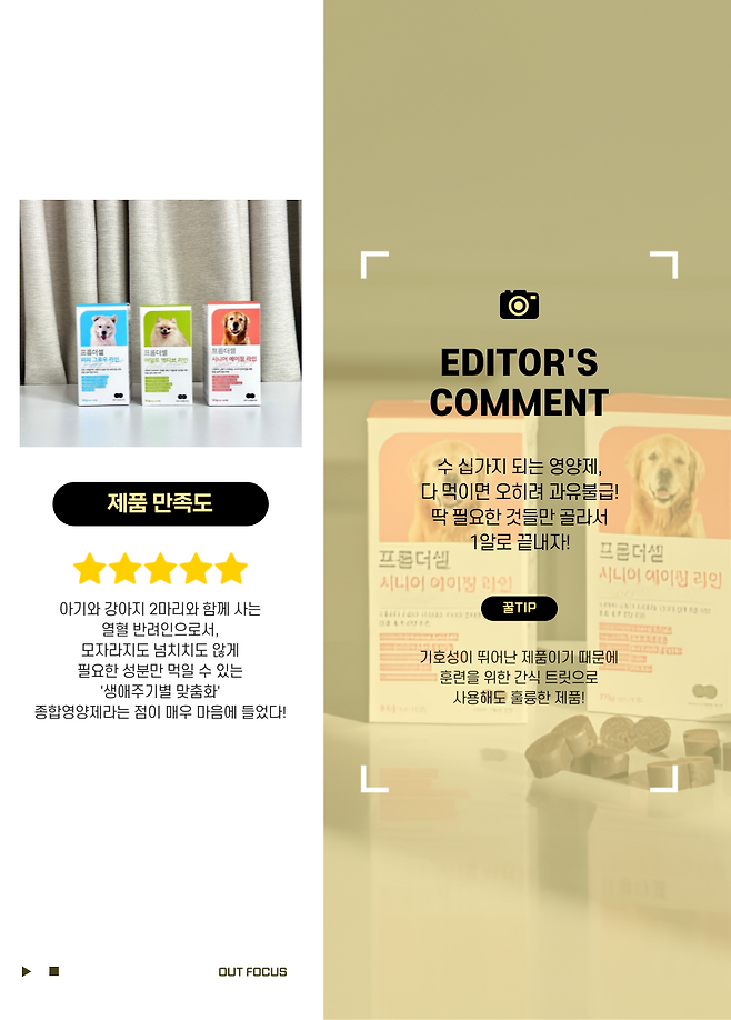 그래서 에디터의 까다롭고 높은 기준을 거치고 거쳐 '1등'으로 손꼽힌 제품이 바로 프롬더셀의 생애주기별 맞춤 강아지 종합영양제 라인이다.