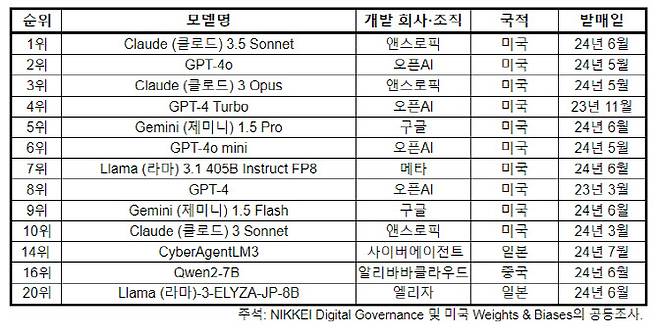 닛케이 디지털 거버넌스와 미국 웨이츠앤바이어스에 따르면 대답은 “아니오”다. 이들이 공동으로 일본 내외 42개 AI모델을 조사한 결과, 상위 10위권을 모두 미국이 개발한 AI가 차지했다. 1위는 엔트로픽의 클로드 3.5 소네트였다.