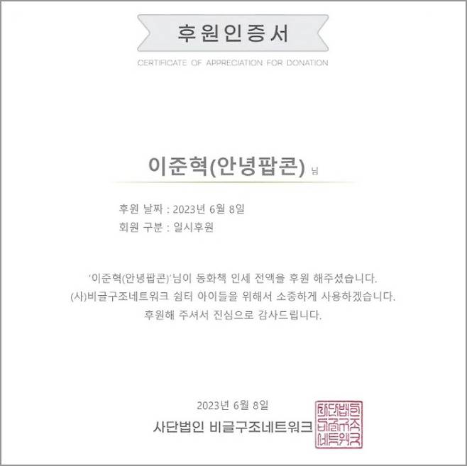 2023년 6월, 이준혁은 원작자로 참여한 동화책 ‘안녕 팝콘'의 인세 전액을 기부했습니다. 출간을 준비하는 단계부터 인세 전액을 동물보호단체에 기부하기로 한 것인데요. 이준혁의 선한 영향력은 그전부터 이어져 왔습니다. 2017년, 이준혁은 KBS 드라마 <맨몸의 소방관>에 출연하며 자기 몸을 아끼지 않고 화재 현장에 뛰어드는 용맹한 소방관 강철수 역을 연기했습니다. 촬영 이후 소방관의 고충에 크게 공감한 그는 출연료 전액을 소방 공무원들에게 기부하며 일찌감치 훈훈한 모습을 선보인 바 있는데요. 2020년엔 소방청의 명예 소방관으로 임명되어 홍보대사로 활동하기도 했습니다. 소방대원과 연이 깊은 그는 오는 12월 개봉 예정인 곽경택 감독의 영화 <소방관>에서도 다시 한번 소방대원 역을 맡아 활약할 예정입니다.
