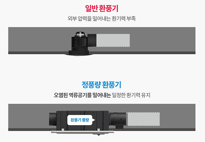 또 하나 주목할 점은 '내·외부 2중 전동 댐퍼'다. 욕실에서 종종 문제가 되는 이웃집 담배 냄새, 하수구 악취, 해충 같은 오염 요인들을 차단하는 역할을 한다. 특허받은 전동 댐퍼 구조가 공기 흐름을 철저하게 제어하고 이중으로 차단해 역류를 원천 봉쇄하는 원리다. 또한, 환풍기 작동 중이 아닐 때도 외부 공기가 역류하는 걸 막아 언제든 깨끗한 욕실을 유지할 수 있다.