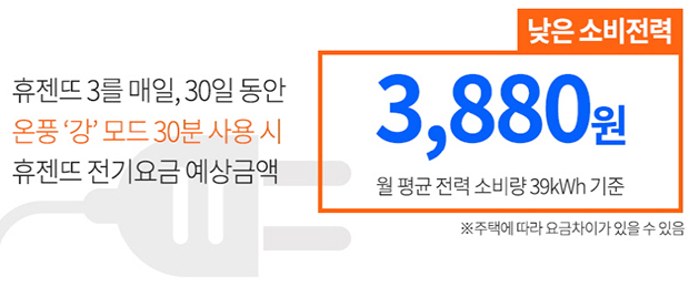 먼저 전력 소모. 매일 30분씩 한 달간 사용해도 전기요금은 약 3,889원 수준이다(온풍 강 모드 기준, 39kWh). 10W 저전력, 고효율, 저소음(33dB) BLDC 모터를 사용해 에너지 낭비 없이 필요한 기능만 안정적으로 작동시킨다.