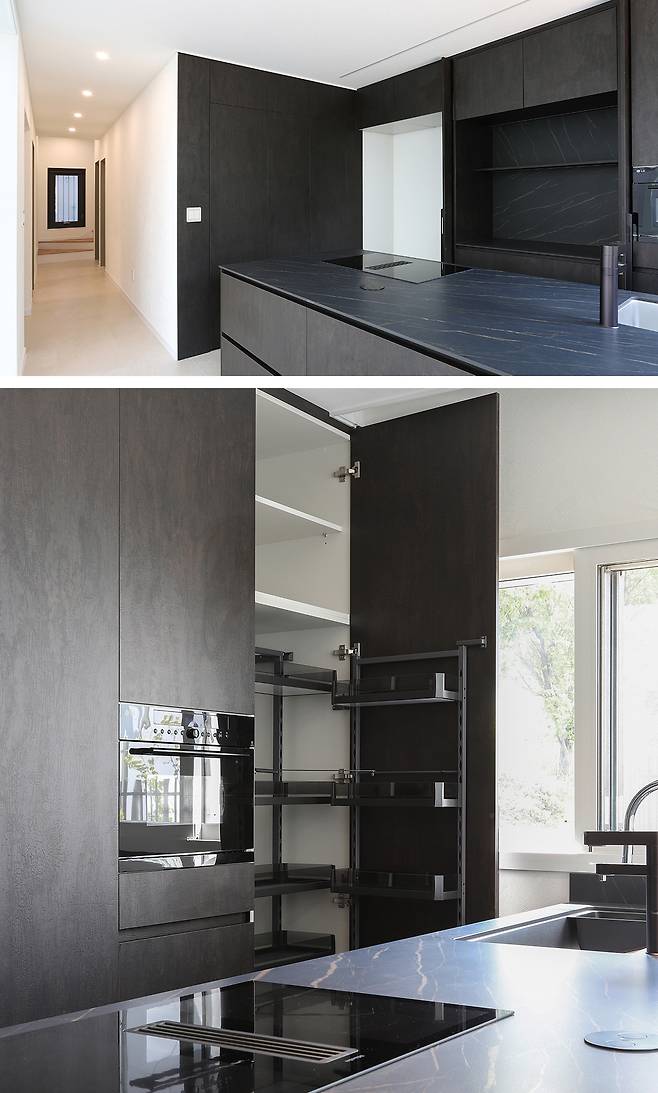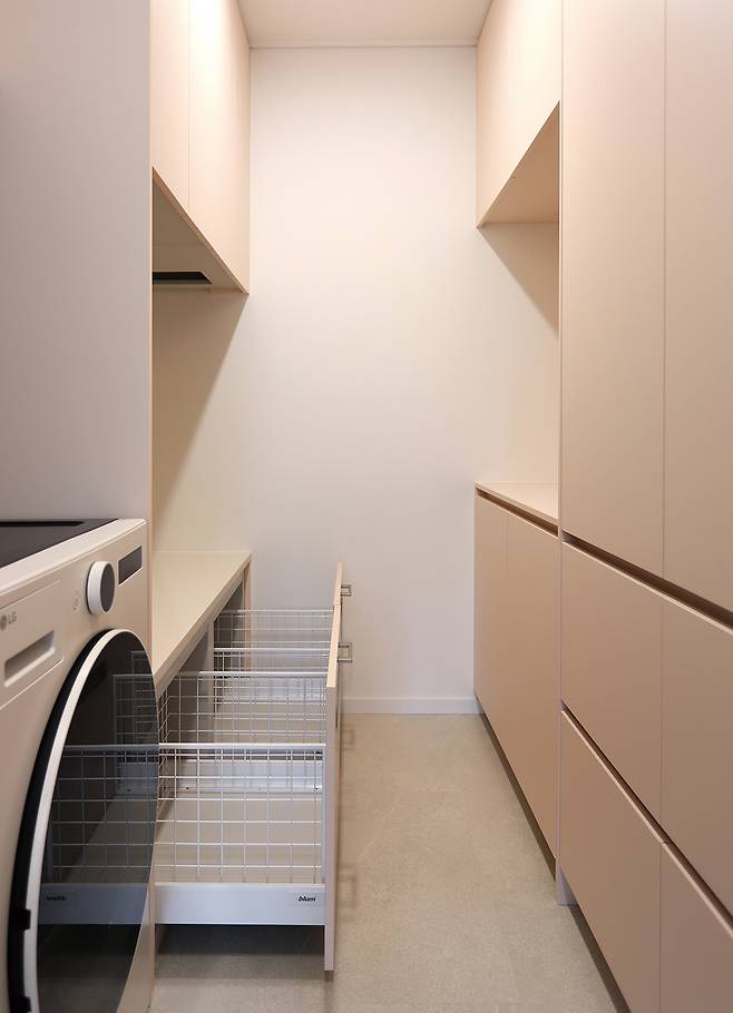 주방 측면 벽면 역시 사비올라(Saviola) 마감재로 마감해 메인 공간과의 시각적 일체감을 높였다. 중앙 도어를 열면 감춰져 있던 보조 주방이 드러나며 공간에 또 하나의 반전을 선사한다. 메인 주방이 묵직한 질감과 차분한 컬러로 안정감 있는 분위기를 연출했다면, 보조 주방은 산뜻한 핑크 컬러를 포인트로 사용해 전혀 다른 매력을 보여준다. 이 공간은 세탁기장과 키 큰 수납장으로 구성되어 뛰어난 수납을 자랑하며, 세탁기장 하부에는 빨래를 분류해 넣을 수 있는 서랍을 설계해 가사 동선과 실생활의 편의성까지 세심하게 고려했다.