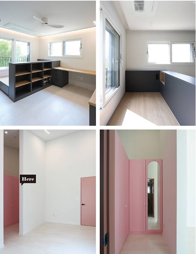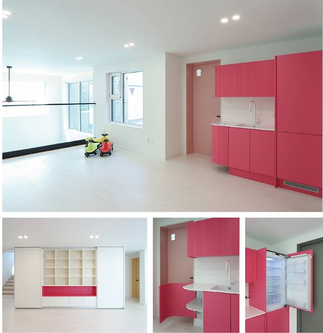 미니 주방 맞은편에는 자녀들을 위한 책장을 제작해 수납의 실용성을 확보했다. 중앙에는 핑크 컬러의 포인트 오픈박스를 더해 미니 주방과의 컬러감을 맞추며 공간 전체에 통일감을 주었다. 또한, 슬라이딩 도어를 적용해 자주 사용하지 않는 물건이나 지저분할 수 있는 부분은 보이지 않도록 가려 실용성과 디자인을 동시에 만족시켰다.