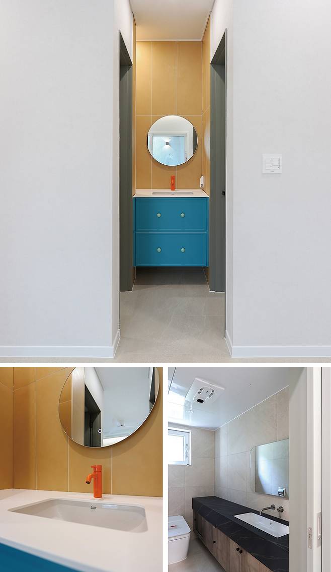 1층에는 서로 다른 매력을 지닌 두 가지 세면대 공간이 구성되어 있다. 첫 번째는 유니크한 컬러가 돋보이는 건식 세면대이다. 욕실처럼 비교적 작은 공간이거나 벽면에 마감이 들어가는 곳은 이처럼 색감에 포인트를 주면 개성 있고 감각적인 ‘나만의 공간’으로 연출할 수 있다.