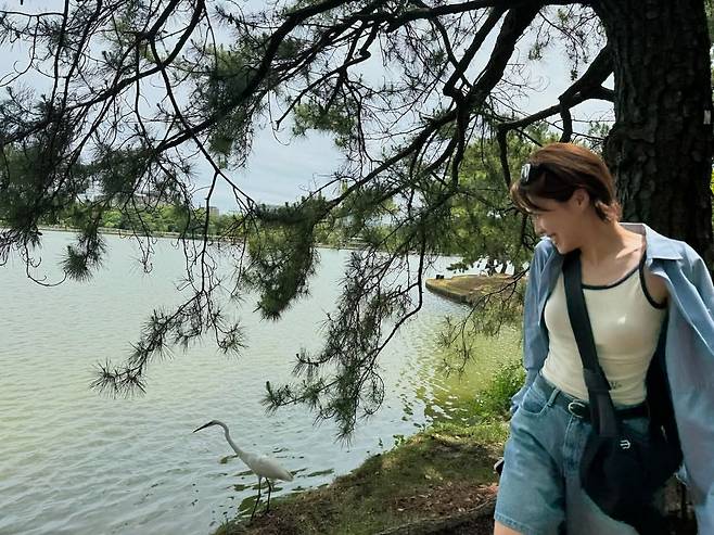 호수가 보이는 자연 속에서 장도연이 편안한 캐주얼 룩을 선보이고 있다. 하늘색 오버셔츠와 화이트 이너, 청바지의 조합으로 상쾌한 분위기를 자아낸다. 크로스백을 매치해 실용성을 더했으며, 자연 속에서 여유로운 미소를 지으며 한 마리 백로와 함께 한 컷을 완성했다. 짧은 헤어스타일이 시원한 느낌을 더하며 봄과 여름 사이 나들이 패션의 좋은 예시를 보여주고 있다.