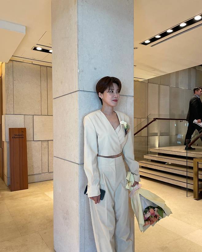 장도연이 화이트 컬러의 세련된 세트업을 선보이고 있다. 브이넥 디자인의 상의와 와이드 팬츠로 구성된 이 앙상블은 허리에 벨트로 포인트를 주어 실루엣을 강조하고 있다. 특히 어깨 라인을 살린 재킷 디자인이 장도연의 세련된 이미지를 한층 돋보이게 한다. 손에는 꽃다발을 들고 가슴에는 작은 꽃 장식을 더해 화이트 의상에 생기를 불어넣고 있다. 공식 행사장으로 보이는 실내에서 우아함을 연출하며 모던한 스타일링을 완성했다.