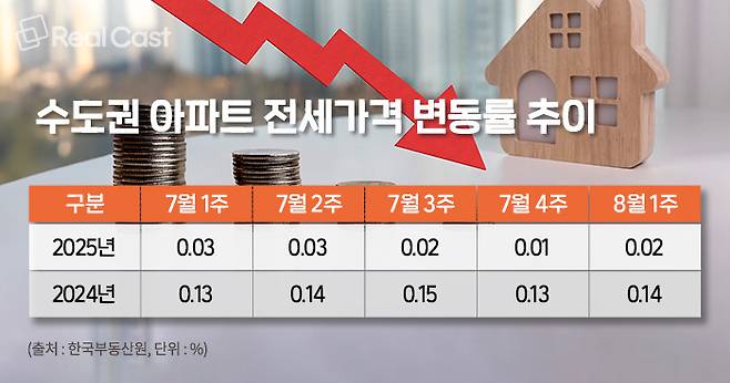 실제 한국부동산원에 따르면 수도권 아파트 전세가격 변동률은 7월 1주 0.03%를 기록한 이후 대동소이한 흐름을 이어가며 8월 1주차에도 0.02% 상승한 것으로 확인했습니다. 지난해 동기 0.1%를 상회했던 것과 비교하면 안정된 흐름을 이어가고 있는 상황입니다.