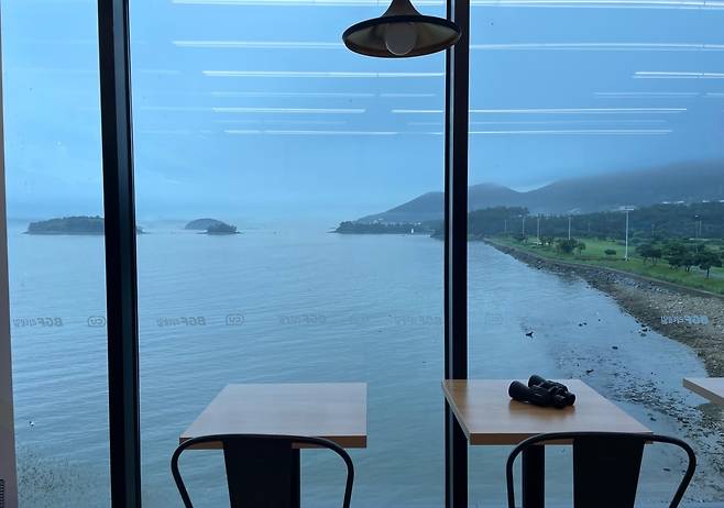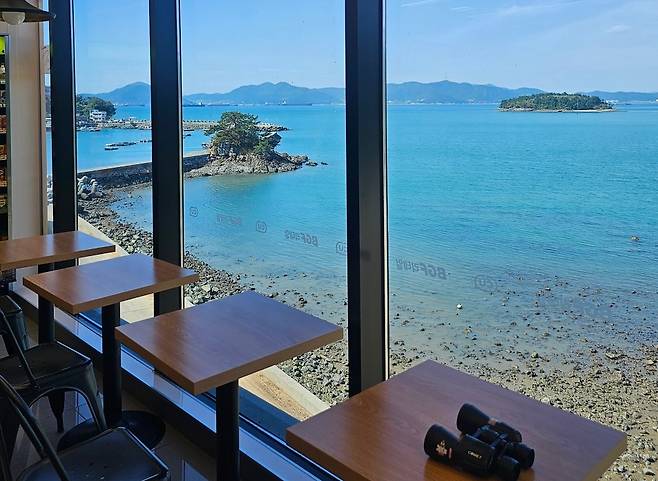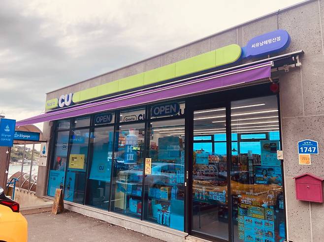 CU 남해평산점에서는 과자 한 봉지를 사는 가격으로 5성급 호텔 못지않은 뷰를 감상하는 호사를 누릴 수 있다. 편의점 한쪽 면 전체가 통창으로 돼 있어 창밖을 내다보면 푸른 여수 앞바다가 막힘없이 한눈에 들어온다.