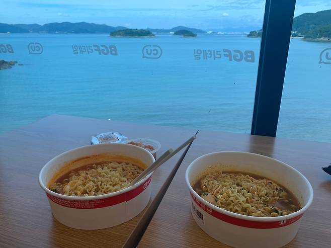 더 큰 묘미는 창가 자리에 마련된 취식 공간인데 한 사람만 앉을 수 있는 탁자가 적당한 간격을 두고 배치돼 있다. 편의점에서는 즉석 라면 서비스를 제공하고 있어 누구의 방해도 받지 않고 라면을 즐기며 바다를 감상할 수 있다.