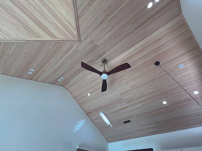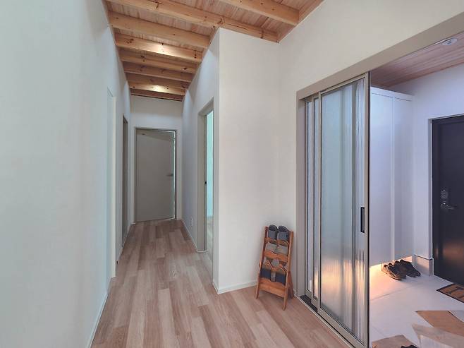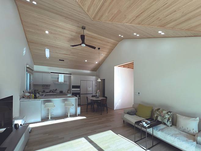 집짓기 히스토리의 여운을 기억하며 건축주와 함께 집안 곳곳을 둘러봤다. 고급스러운 프로미 메탈 도어 현관문과 슬림 3연동 모루 유리중문 사이의 전실은 넓은 공간감으로 실내의 시작을 연출한다. 서가 느낌을 주는 구조재로 시공한 복도의 천장은 한옥 느낌을 자아냄과 동시에 거실의 천장 루바와 연계돼 목조 주택의 아늑함을 살린다. 특히, 우드 톤의 히노끼 무절 루바는 옹이 없는 깔끔한 마감으로 실내에 고급스러운 분위기를 불어넣는다. 실내 인테리어는 전체적으로 화이트 톤의 벽과 우드 톤의 천장과 바닥이 조화를 이뤄 깔끔한 인상을 선사한다.