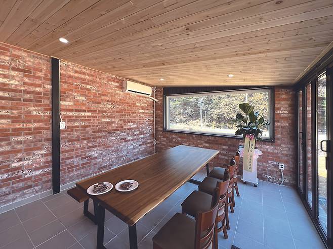 개방형 지붕 아래 마련한 야외 파고라는 마을 잔치, 친지 모임 등 다용도로 활용 가능한 공간이다. 야외 싱크대를 설치해 조리가 가능하도록 구성했다. 주택 후면에는 8평 규모의 널찍한 선룸도 마련했다. 지붕과 측면을 벽돌로 마감해 내장 인테리어 효과가 나도록 했고, 한쪽 면에는 폴딩도어를 설치해 실외로의 확장성을 기했다. 파고라와 선룸을 후면에 배치해 주택의 뒤쪽 공간의 활용성을 높인 게 무엇보다 인상적이다.