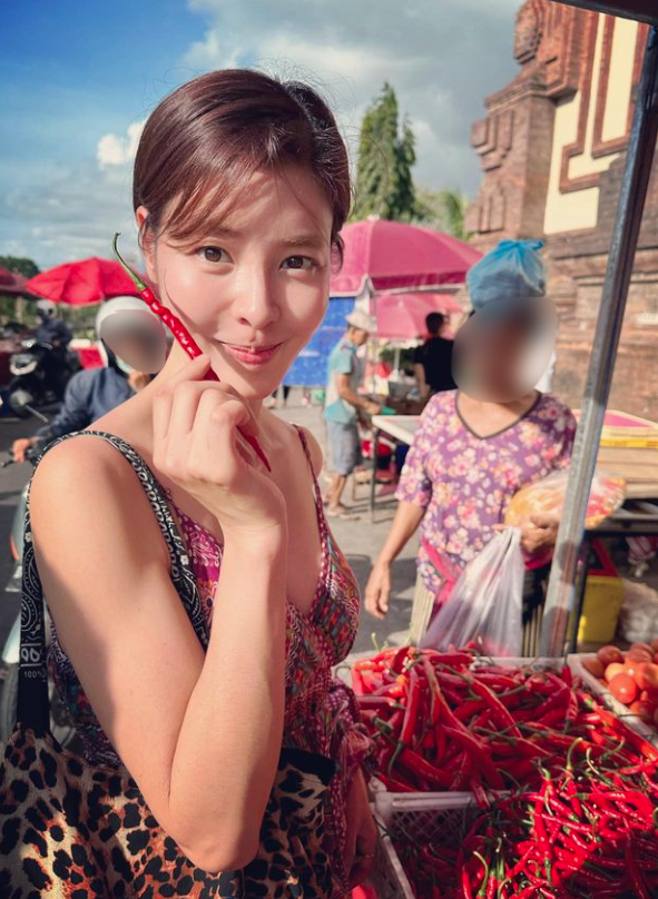 김규리는 유니크한 패턴의 원피스를 입고 레오파드 문양의 숄더백으로 화려한 바캉스룩을 연출했습니다.