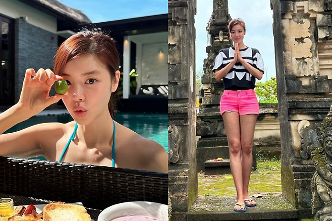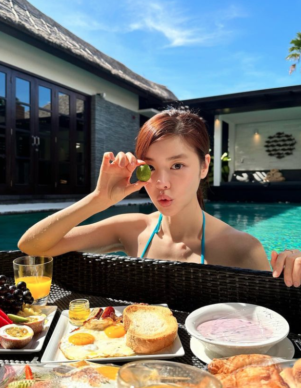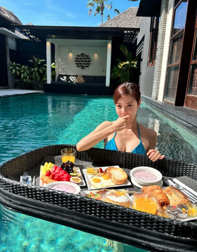 김규리는 수영장에서 블루 계열 수영복을 입고 조식을 즐기고 있는데요.