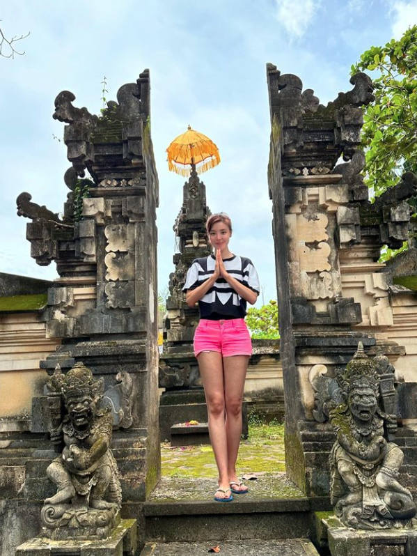 김규리는 헤어를 올려묶고 블루 계열 수영복으로 상큼 발랄한 룩을 완성했어요.