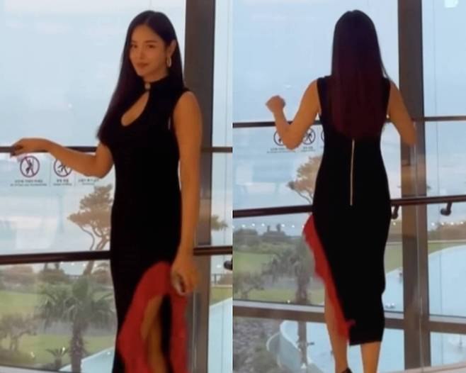 특히, 드레스 하단에 배색된 레드 프릴 슬릿이 걸을 때마다 드러나며 은근한 관능미를 자아냈습니다.