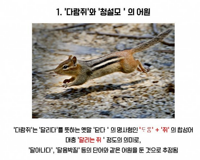 다람쥐: 작고 줄무늬 있음 / 조용하고 소심 / 사람이 가까이 가면 바로 도망