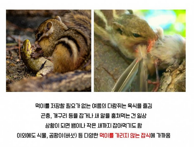견과류, 열매 외에도 새의 알, 유충, 병아리까지 섭취