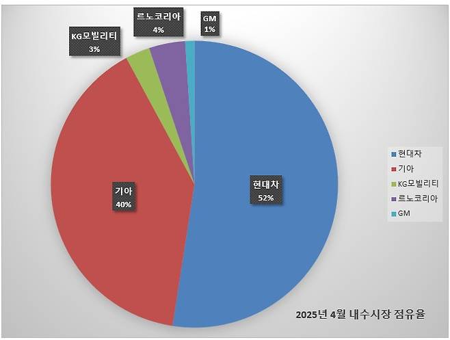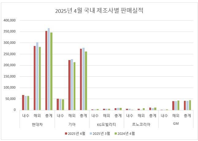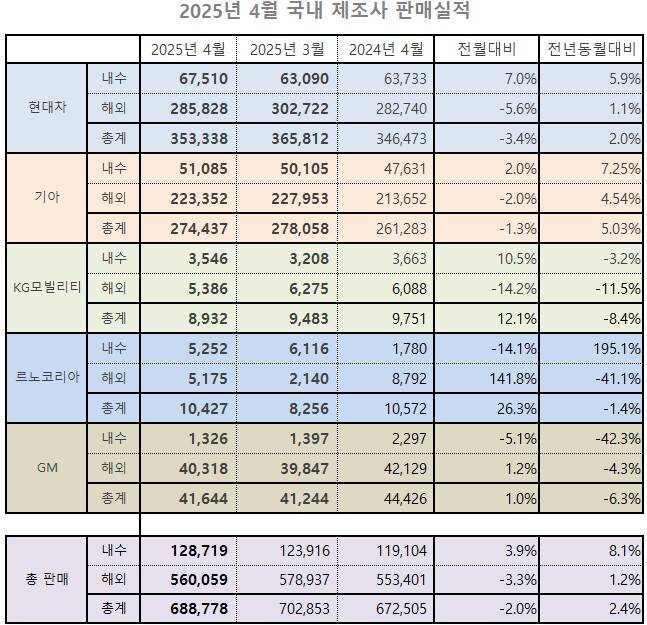 2025년 4월, 국내 완성차 5개사의 글로벌 판매 실적이 총 68만 8,778대를 기록하며 전년 동월 대비 소폭 상승한 것으로 나타났다. 현대차와 기아가 내수 및 수출 모두에서 안정적인 성장세를 이어간 가운데, 르노코리아는 신차 효과에 힘입어 내수 실적이 세 배 가까이 증가하며 주목받았다. 반면 KG 모빌리티는 수출 조정 여파로 실적이 감소했고, GM 한국사업장은 트랙스 크로스오버 중심의 수출 호조를 기록했으나 내수 부문에서는 여전히 부진한 모습이다.