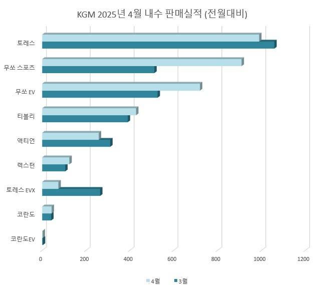 KG 모빌리티는 내수 3,546대, 수출 5,386대 등 총 8,932대를 판매하며 전년 동월 대비 8.4% 감소했다. 수출 물량 일부가 선적 일정 이월로 인해 줄어든 것이 주요 원인으로 분석된다.