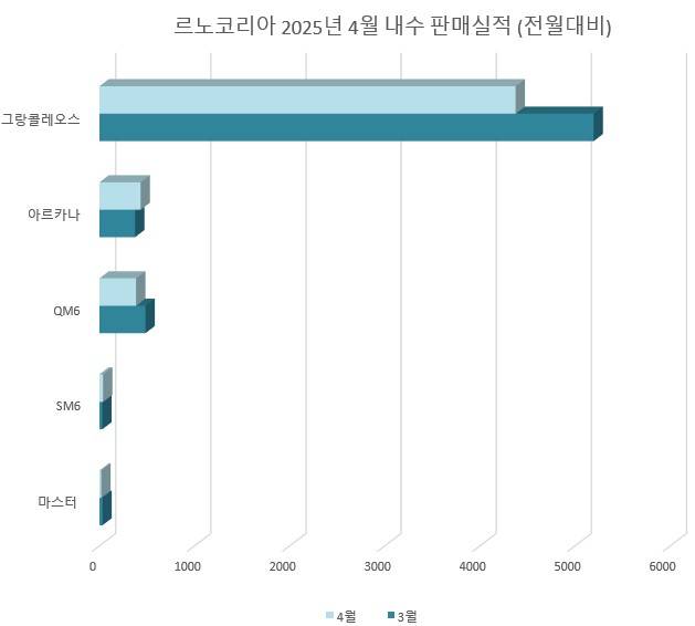 주력 모델은 중형 SUV 그랑 콜레오스로, 한 달간 4,375대가 판매돼 전체 내수 실적의 83% 이상을 차지했다. 하이브리드 모델 비중도 눈에 띄게 증가해 내수 판매의 75.4%를 차지했으며, 이 중 그랑 콜레오스 E-Tech 하이브리드는 3,858대가 팔렸다. 수출은 아르카나 중심으로 5,175대를 기록했으며, 그랑 콜레오스의 본격적인 해외 출고는 5월부터 진행될 예정이다.