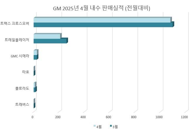 GM은 4월 한 달간 총 4만 1,644대를 판매했으며, 이 중 수출은 4만 318대, 내수는 1,326대였다. 전체 실적은 전년 대비 증가했으며, 특히 쉐보레 트랙스 크로스오버가 수출 2만 7,723대, 내수 1,079대 등 총 2만 8,802대로 GM 실적을 견인했다.