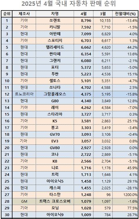 2025년 4월 국내 자동차 시장에서 가장 많이 판매된 모델은 기아 쏘렌토로, 총 8,796대가 출고되며 1위를 차지했다. 이어 카니발(7,592대), 현대 아반떼(7,099대), 스포티지(6,703대), 팰리세이드(6,662대)가 상위권에 올랐다. 특히 팰리세이드는 전월 대비 무려 44.2% 증가하며 두 자릿수 성장률을 기록, 주목을 받았다. 이번 판매 순위에서 현대와 기아 양사의 SUV 모델들이 대부분 상위 10위권을 차지해, 국내 소비자들의 꾸준한 SUV 선호가 다시 한번 확인됐다.