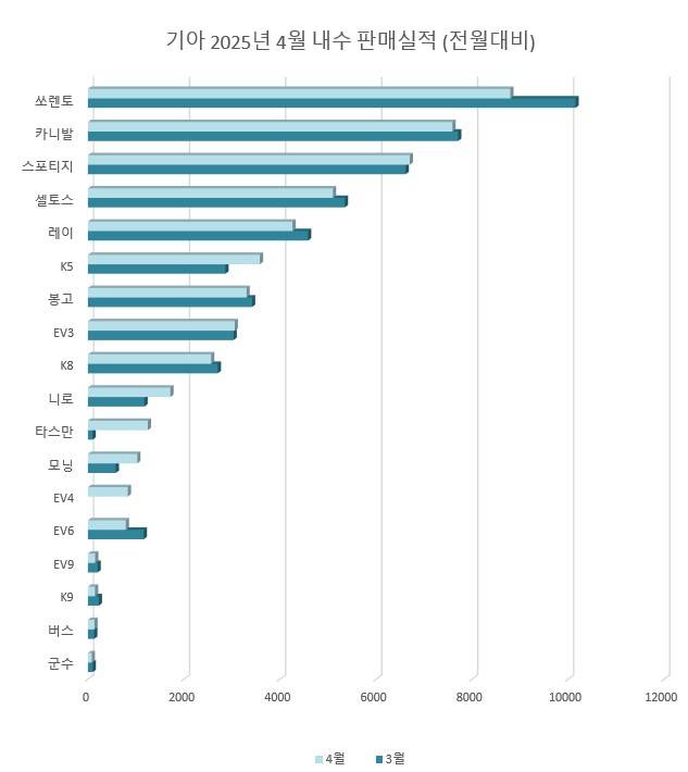 국내에서는 쏘렌토(8,796대), 카니발(7,592대), 스포티지(6,703대), 셀토스(5,101대) 등의 RV가 실적을 이끌었으며, 전기 SUV인 EV3는 3,057대를 기록하며 조기 시장 안착에 성공했다. 해외 시장에서는 스포티지가 4만 1,034대로 최다 판매 모델에 올랐고, 셀토스(2만 442대), K3/K4(1만 6,666대)가 뒤를 이었다. 글로벌에서 스포티지는 총 4만 7,737대로 기아 전체 모델 중 가장 높은 판매고를 올렸다.