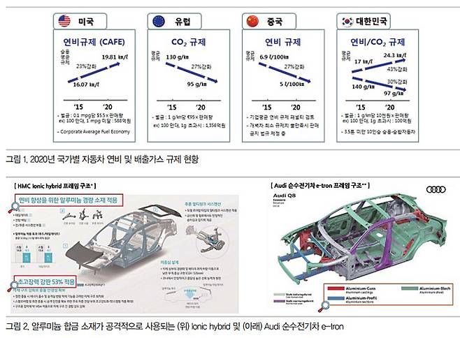 전 세계적으로 기존 연비 및 배출가스 규제는 권고 사항이었으나, 2020년을 기준으로 대부분의 국가에서 연비 및 배출가스 규제가 강제 이행으로 변경되었으며, 상당히 극한의 수준을 요구하고 있는 상황이다. 특히 2020년 북미는 승용 평균 연비 19.81㎞/ℓ 규제로 2015년 대비 23% 강화하였고, 동년 유럽은 CO2 배출 95g/km 규제로 2015년 대비 27% 강화되었다. 2020년 국내는 연비 24.3㎞/ℓ, CO2 95g/km 규제로 각각 43%, 30% 강화되었다. 한중 FTA가 체결된 중국은 세계 자동차 생산 및 판매 1위로, 2020년 5ℓ/100㎞의 연비를 만족하지 못할 경우 인증장을 발급받지 못해 차량 판매가 불가능하게 된다. 따라서 더욱 강력하고 경제적인 경량화 기술 확보가 시급하다.