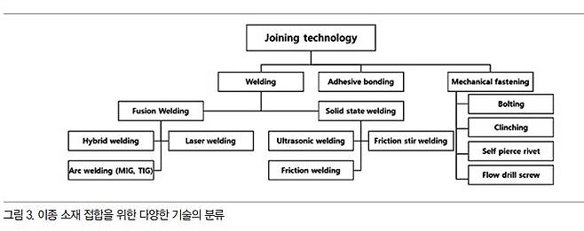 이종 소재 접합을 위한 방법은 크게 기계적 툴을 이용해 접합하는 (1) 기계적 접합과 (2) 용접 등의 접합 및 무기·유기 접착제를 이용해 접합하는 (3) 접착제 접합 등으로 분류된다.