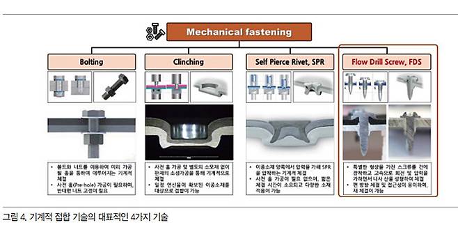 기계적 접합 기술은 소재 접합 기술 중 가장 오래된 기술로, 용접이 어려운 소재들에 대한 현실적 대안으로 평가받고 있다. 대표적으로 볼트/너트 체결(Bolting), 셀프 피어스 리벳(Self-Pierce Rivet), 플로우 드릴 스크류(Flow Drill Screw), 그리고 클린칭(Clinching) 등이 있다.