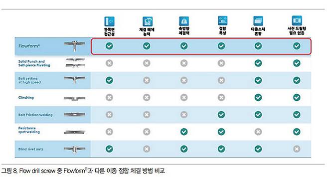 플로우 드릴 스크류(Flow Drill Screw)는 스크류를 건에 장착한 후 순간적으로 일정 압력을 가하여 암 나사를 성형하여 체결하는 방식이다. Pre-drilling 공정이 필요 없으며 생산성 및 작업 효율이 높다는 장점이 있다. 다양한 소재의 이종 접합이 가능할 뿐만 아니라 구조용 접착제와 혼용할 수 있어 매우 활용도가 높다.