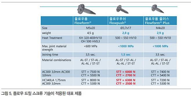 플로우 드릴 스크류(Flow Drill Screw)는 스크류를 건에 장착한 후 순간적으로 일정 압력을 가하여 암 나사를 성형하여 체결하는 방식이다. Pre-drilling 공정이 필요 없으며 생산성 및 작업 효율이 높다는 장점이 있다. 다양한 소재의 이종 접합이 가능할 뿐만 아니라 구조용 접착제와 혼용할 수 있어 매우 활용도가 높다.