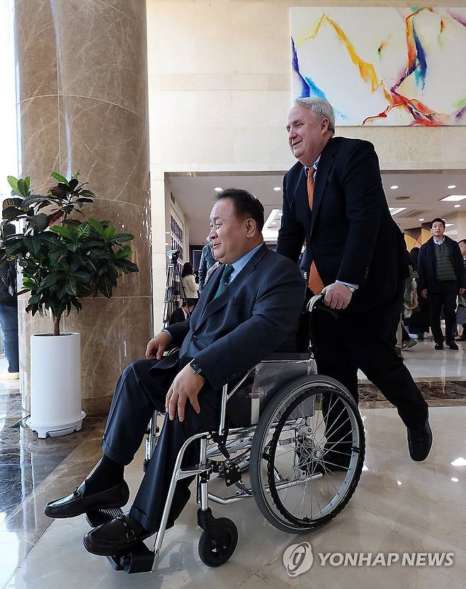 (대전=연합뉴스) 김준범 기자 = 21일 오후 대전 한국과학기술원(KAIST)에서 국민의힘 인요한 혁신위원장이 더불어민주당 이상민 의원 휠체어를 밀어주고 있다. 이 의원은 이날 국민의힘 혁신위 강연자로 나섰다. 2023.11.21