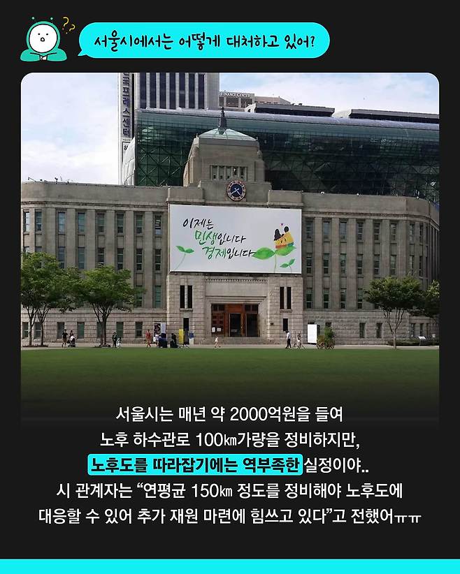 서울시는 매년 약 2000억원을 들여 노후 하수관로 100㎞가량을 정비하지만, 노후도를 따라잡기에는 역부족한 실정입니다.