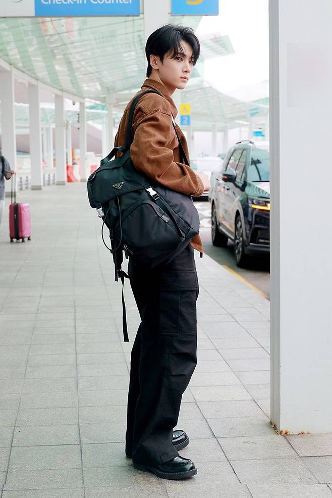 희승은 스포티한 칼리지 패치가 돋보이는 캐시미어 가디건과 베이직한 팬츠, 사피아노 가죽 트래블 백으로 클래식한 가을룩을 연출했다.