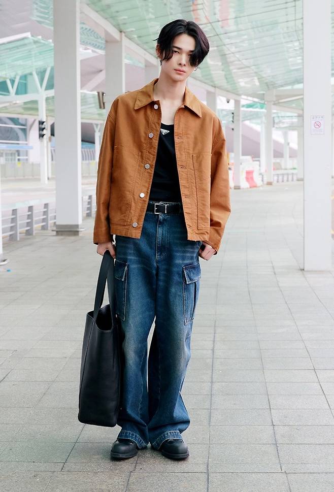선우는 코듀로이 다운 베스트와 오버다이 워싱의 루즈핏 데님 팬츠, 여기에 타이를 포인트로 댄디한 캐주얼룩을 연출했다.