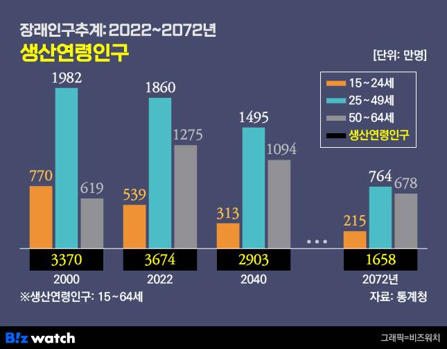 인구 감소는 곧장 경제활동인구의 감소로 이어진다. 통계청은 2022년 3674만명이었던 생산연령인구(15~64세)가 2072년 1658만명까지 절반 이상 뚝 떨어질 것이라고 내다봤다. 한국경제인협회 산하 한국경제연구원도 지난해 발간한 '인구구조 변화가 국내총생산(GDP)에 미치는 영향' 보고서에서 비슷한 전망을 내놨다. 이 보고서는 2050년 생산가능인구(15~64세)가 2398만명으로 2022년(3676만명)보다 약 34.8% 감소할 것으로 예상했다.
