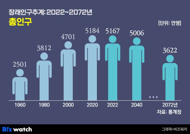 합계출산율이 1을 회복하더라도 인구 감소는 불가피하다. 같은 보고서에 따르면 우리나라 총인구는 2022년 5167만명에서 2072년 3622만명으로 감소할 것으로 추정된다. 인구 3622만명은 1977년 수준이다. 이는 출산율, 기대수명, 국제이동 등 인구 변동 요인을 중위 수준으로 가정해 추정한 수치다.